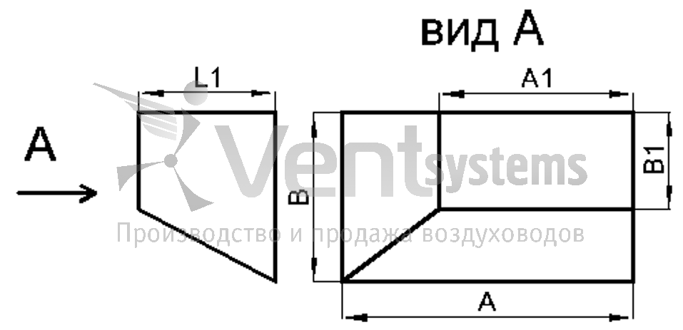 Данный переход стыкует прямоугольные воздуховоды разного размера. Смещение является угловым вправо.